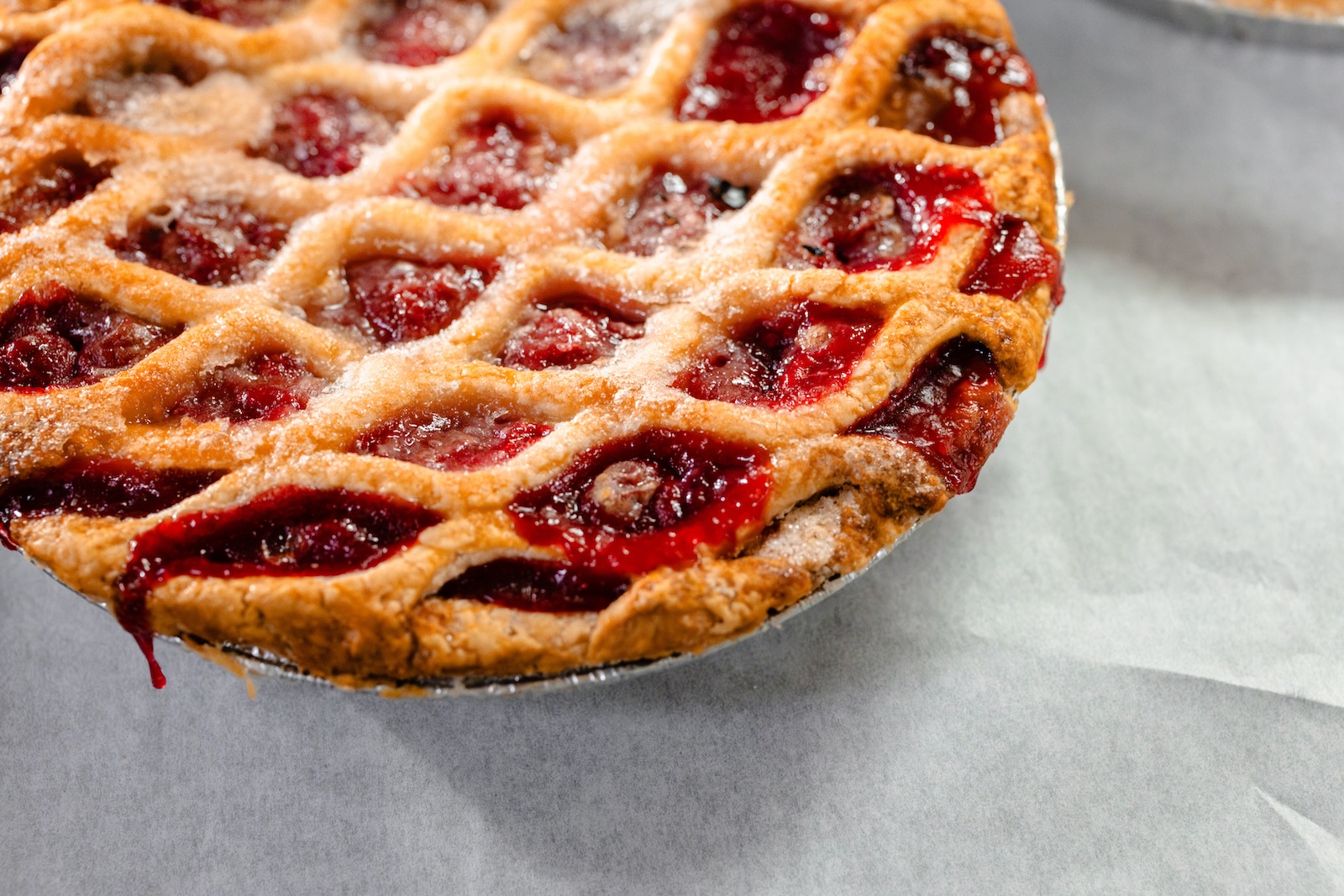 A cherry pie: a golden, flaky crust filled with bright, juicy cherries that strike the perfect balance between sweet and tart. It's a classic and is sure to please at your next party or neighborhood dinner.